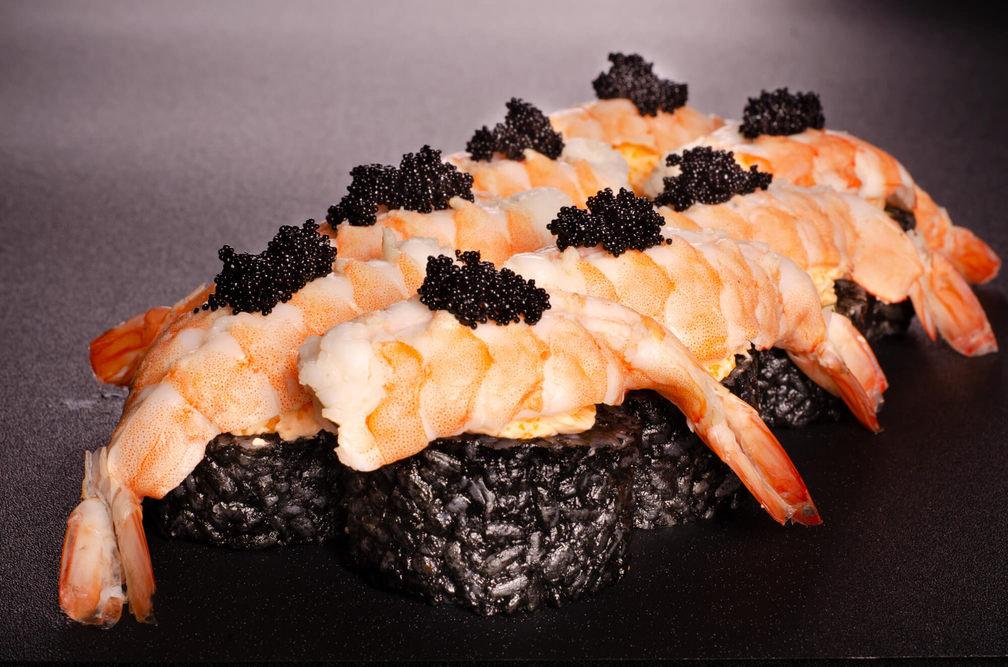 Рол з тигровою креветкою в чорному рисі, з додаванням чорнила каракатиці, ніжним сиром філадельфія та ікрою масаго, огірком, авокадо, салатом айсберг, оздоблений чорною ікрою тобіко.