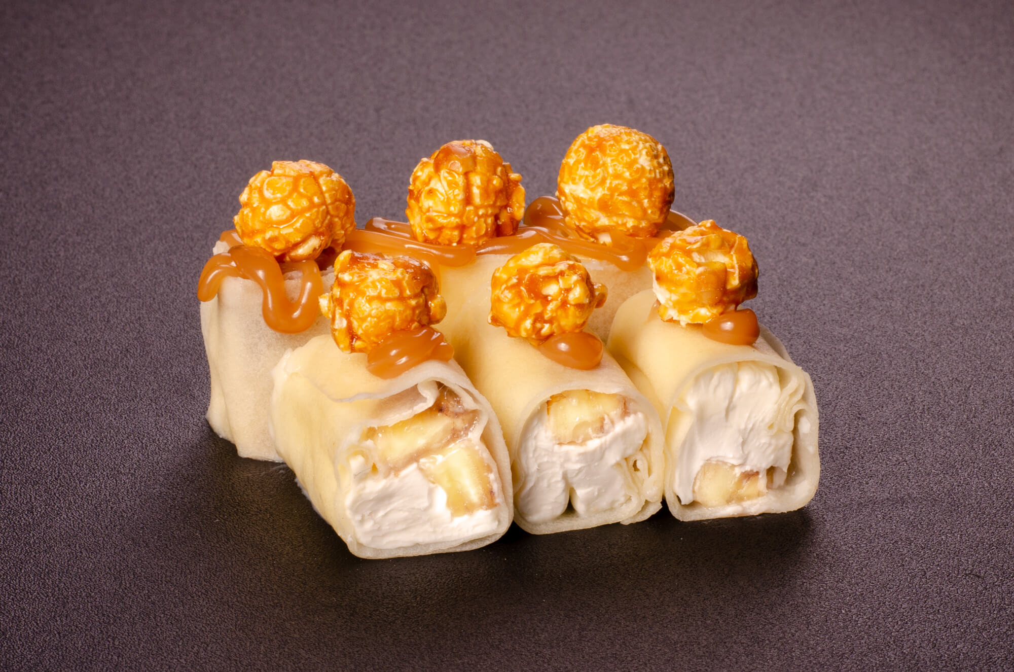 Рол у рисовому тісті з сиром філадельфія, бананом, згущеним молоком, попкорном та карамеллю.
