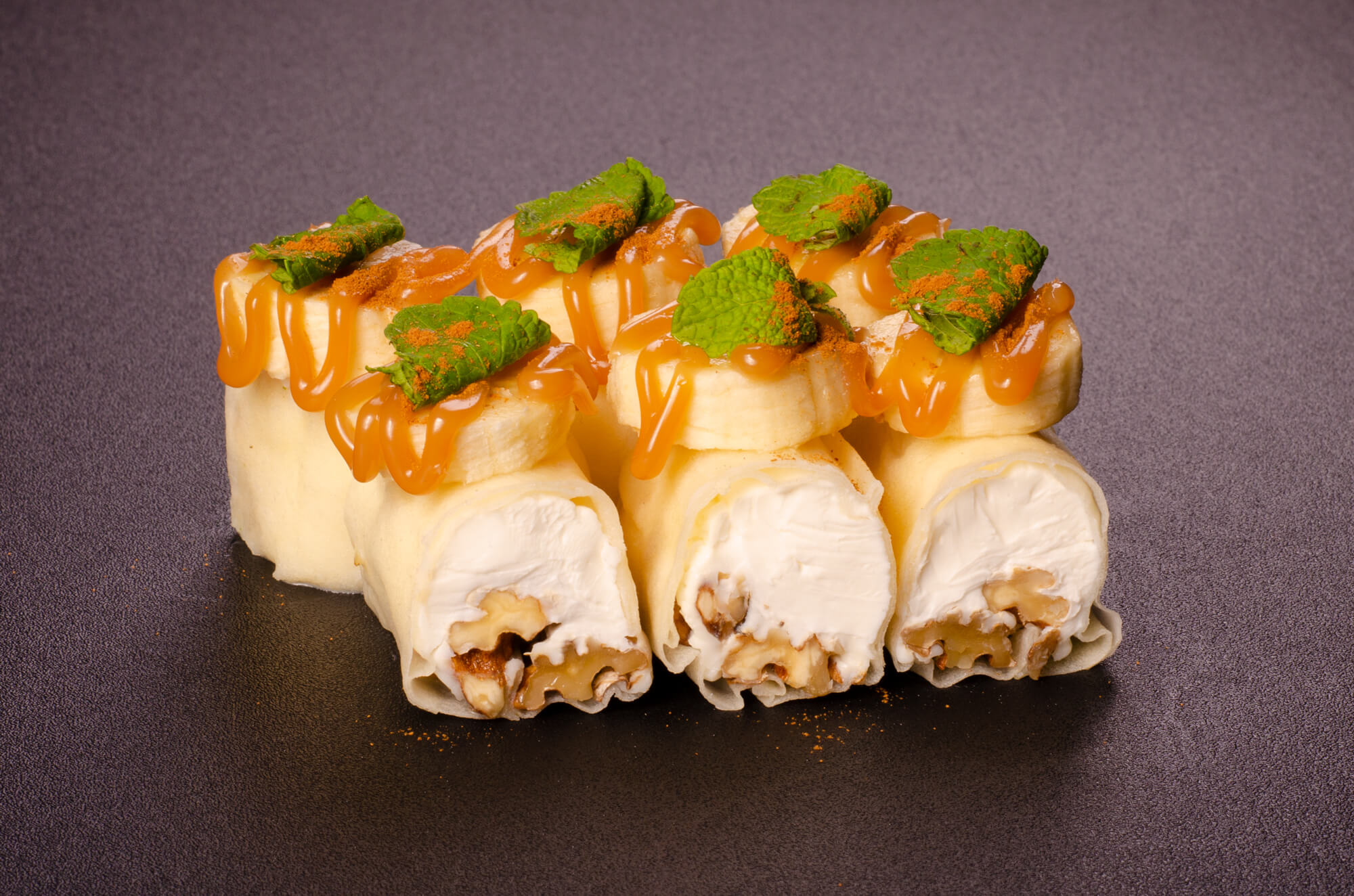 Рол у рисовому тісті з сиром філадельфія, волоським горіхом, згущеним молоком та цукровою пудрою. Прикрашений бананом, карамельним топінгом та м'ятою.