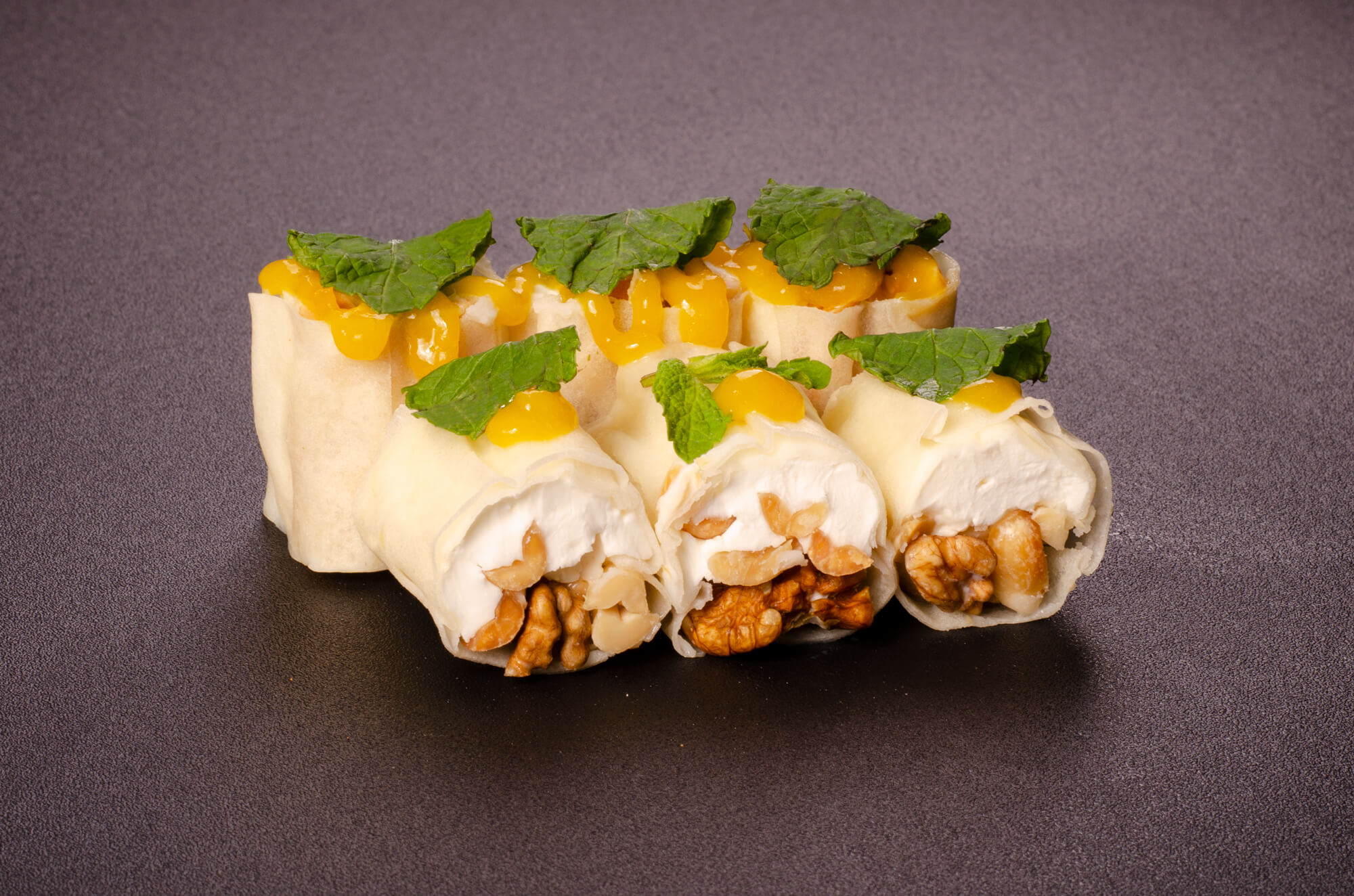 Рол у рисовому тісті з сиром філадельфія, волоським горіхом, арахісом, згущеним молоком та цукровою пудрою. Прикрашений пюре манго та м'ятою.