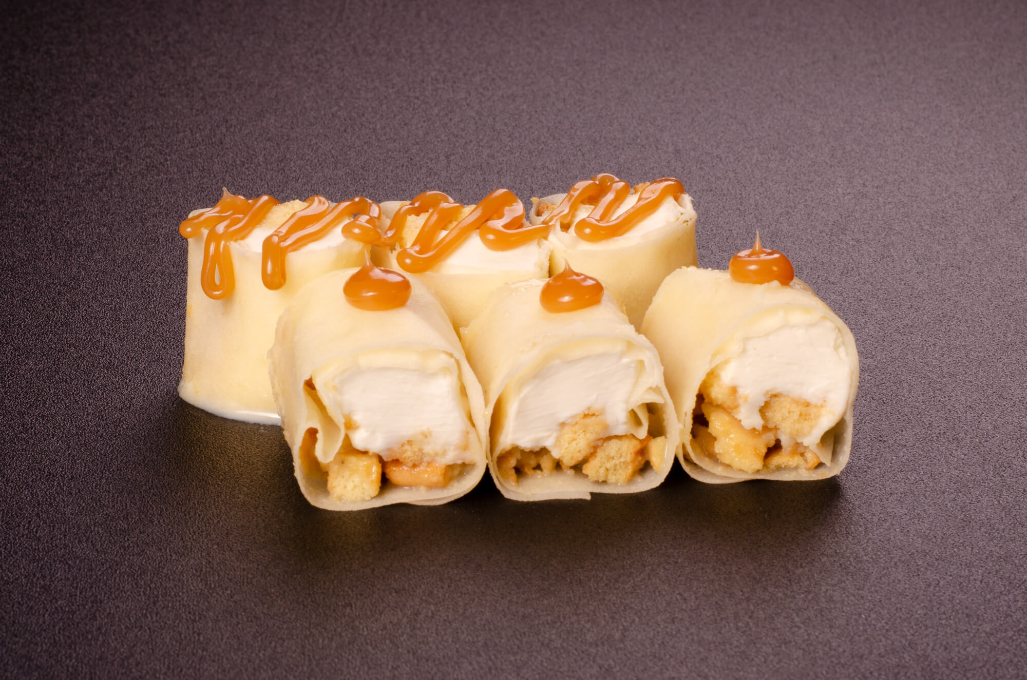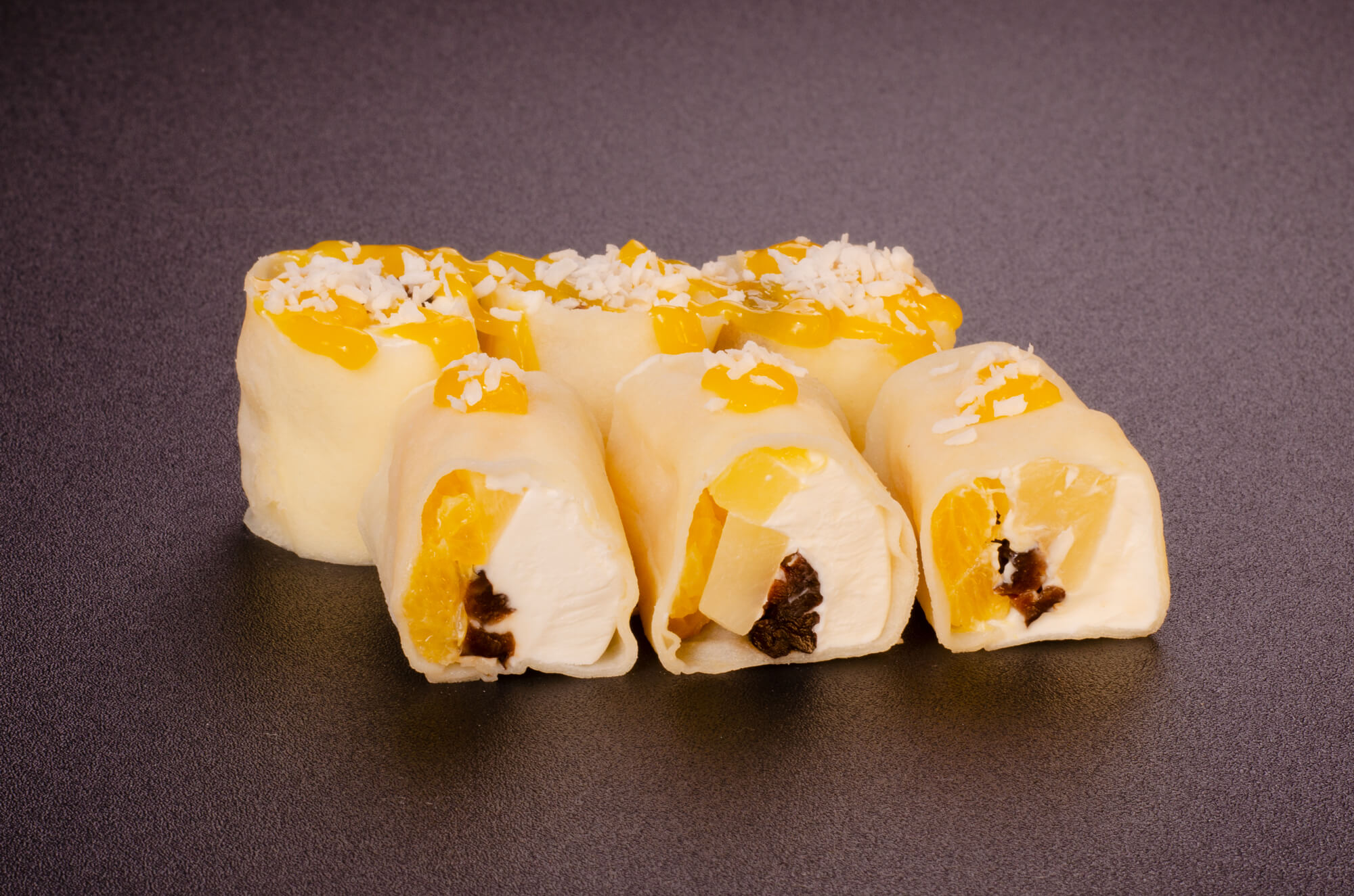 Рол у рисовому тісті з сиром філадельфія, бананом, грушею, апельсином та цукровою пудрою. Прикрашений карамельним топінгом, кокосовою стружкою та м'ятою.