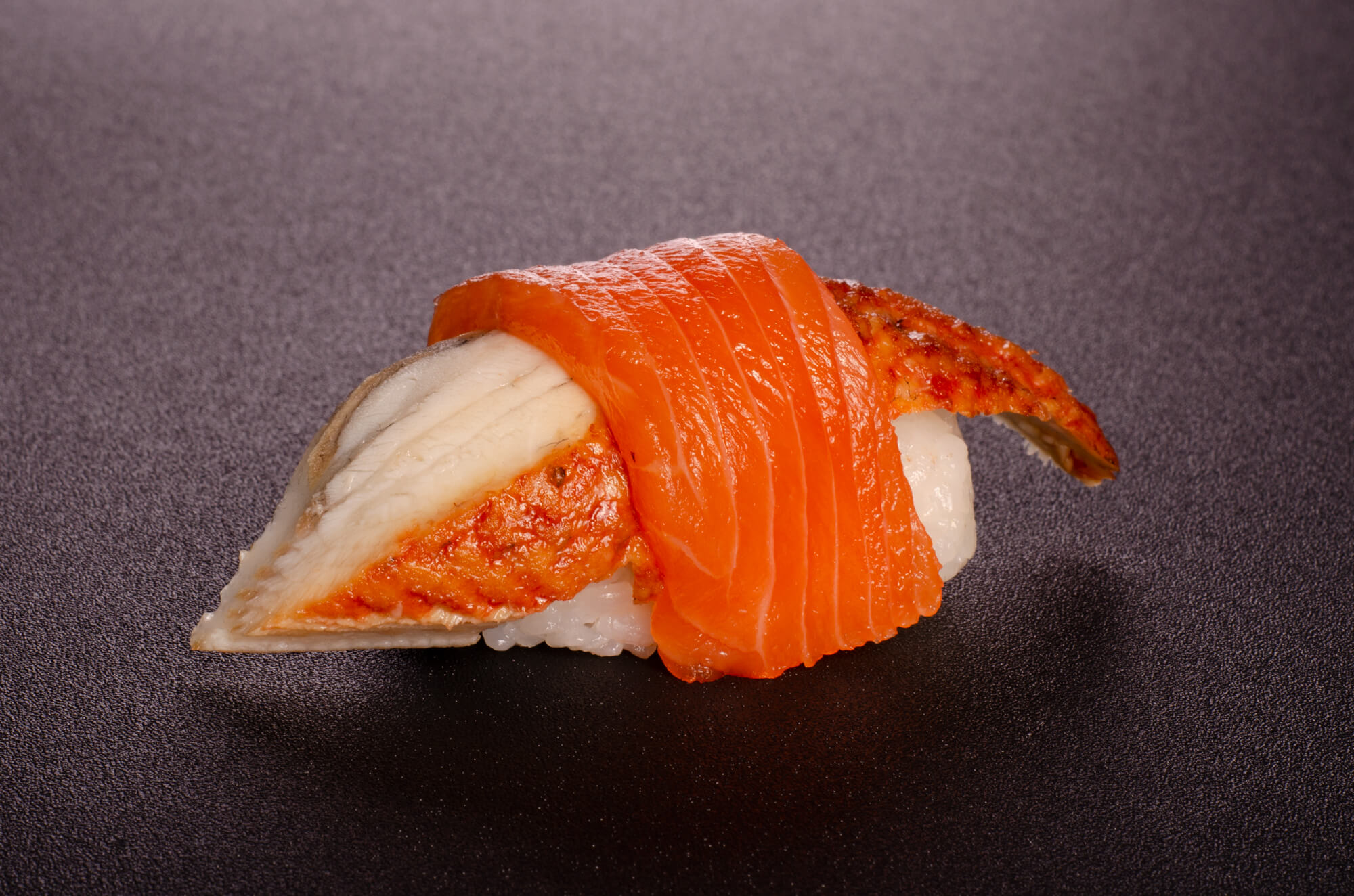 Суші гункан з норвезьким лососем та гострим соусом спайсі.