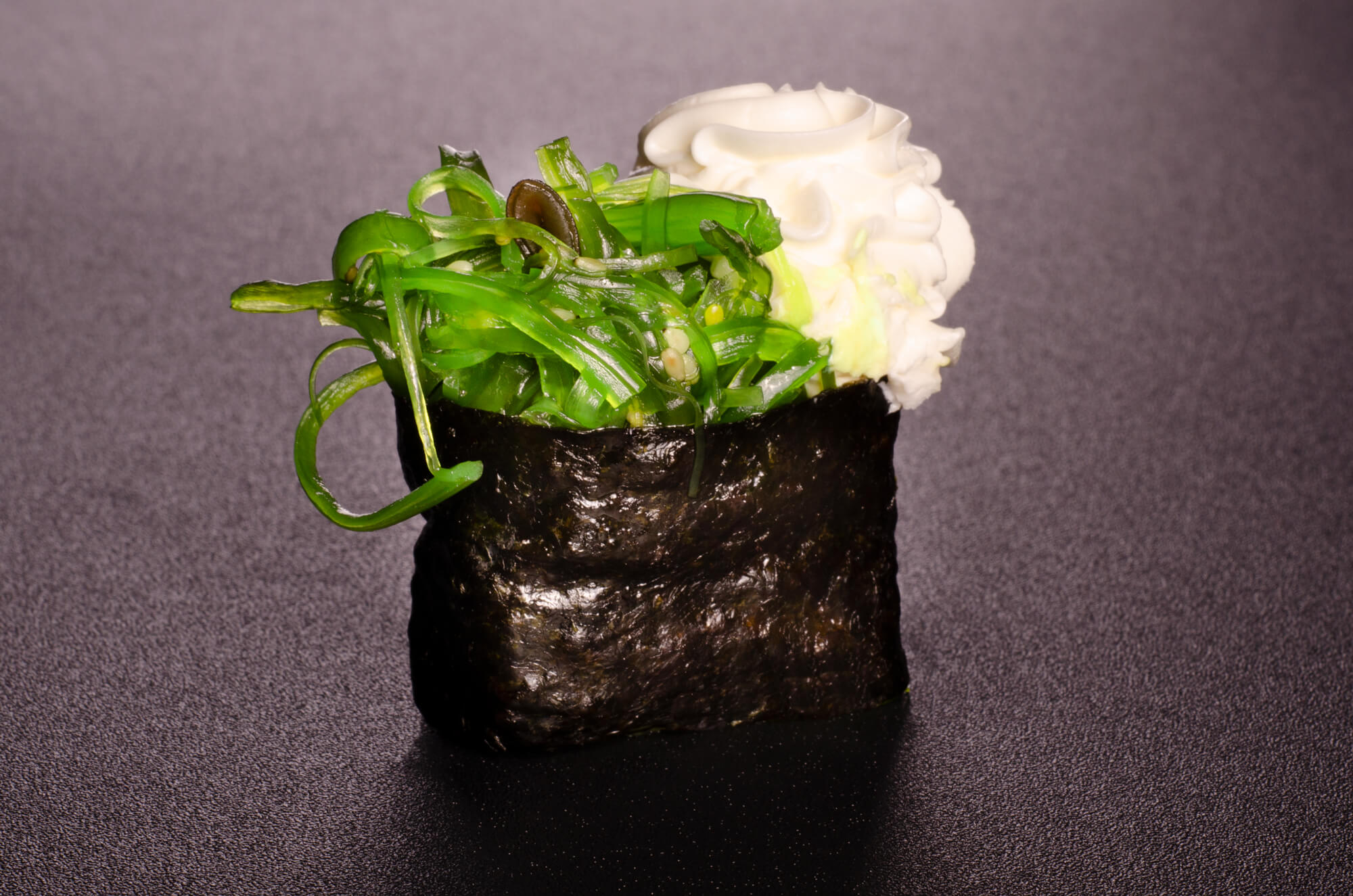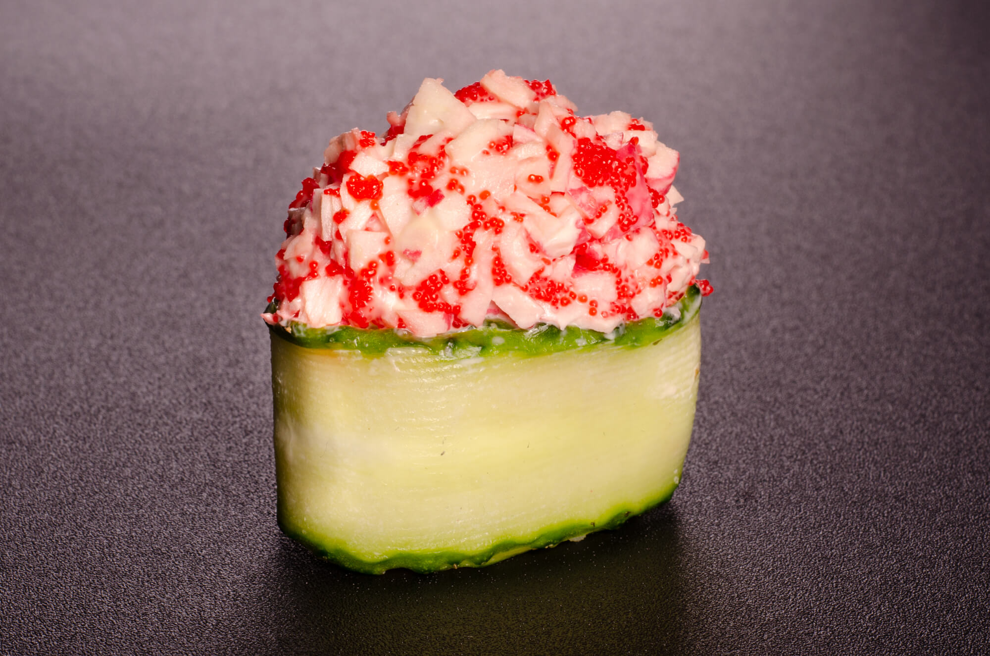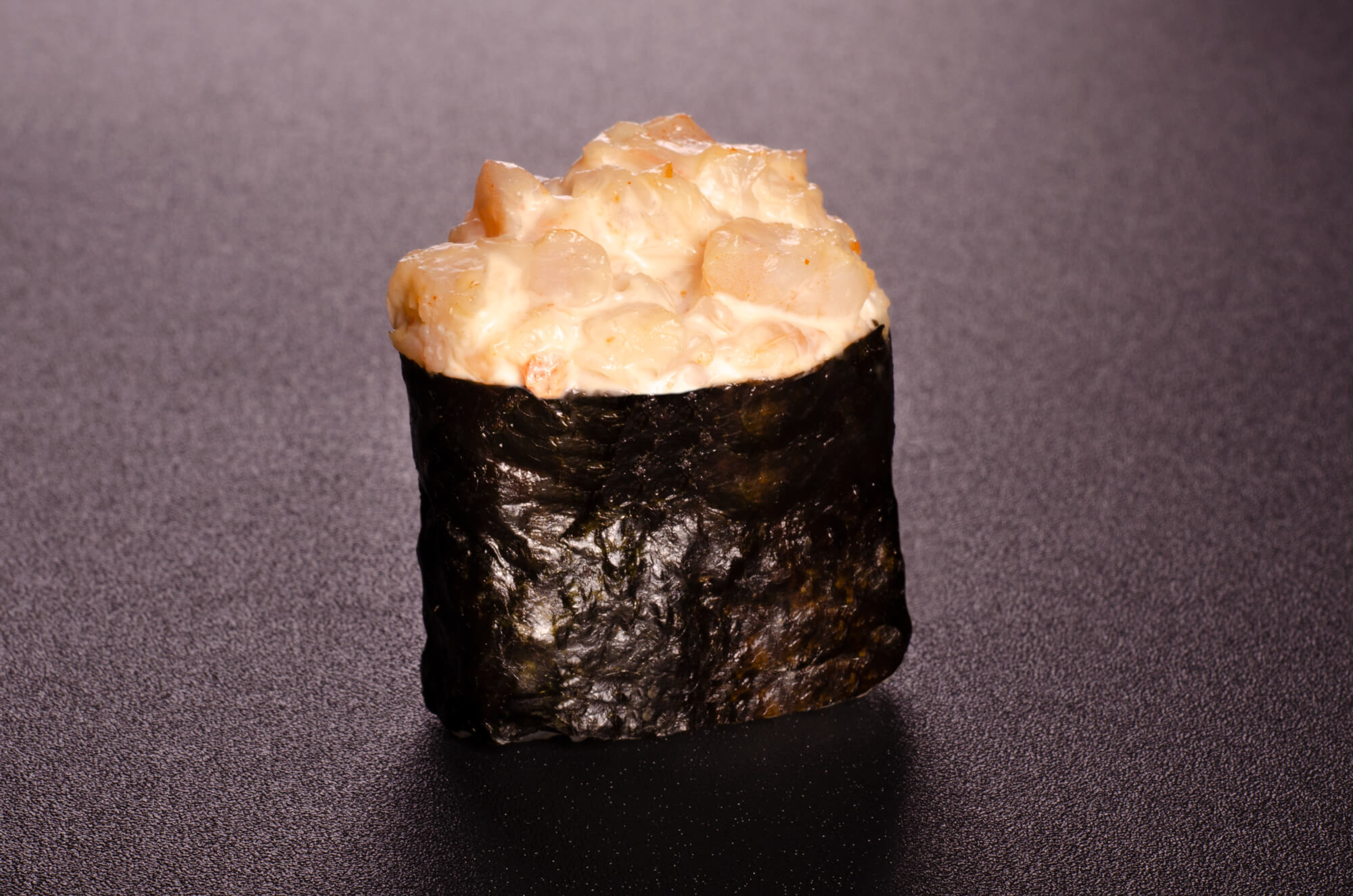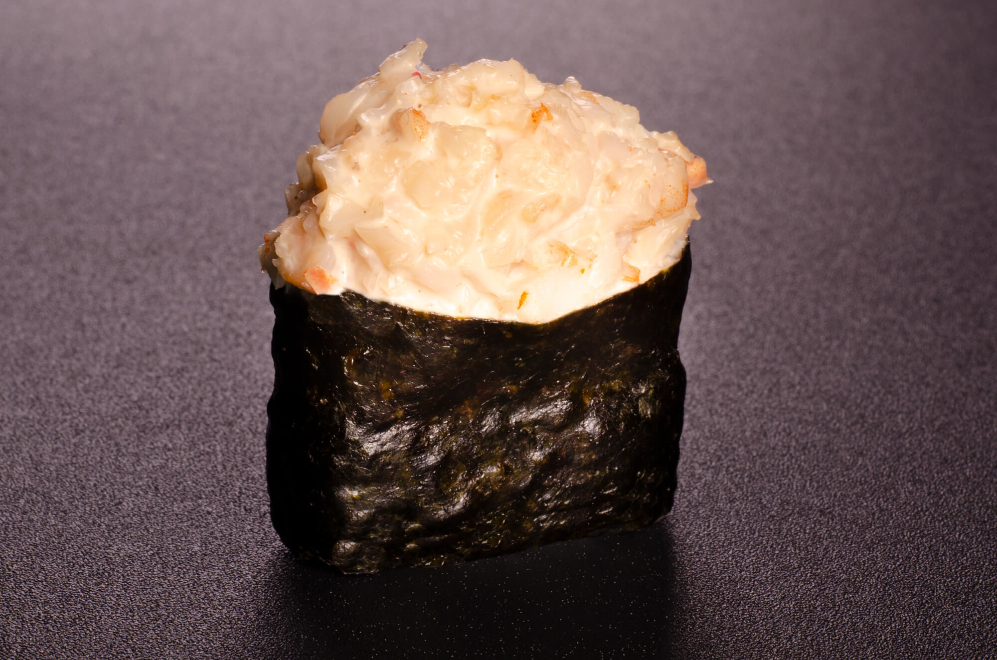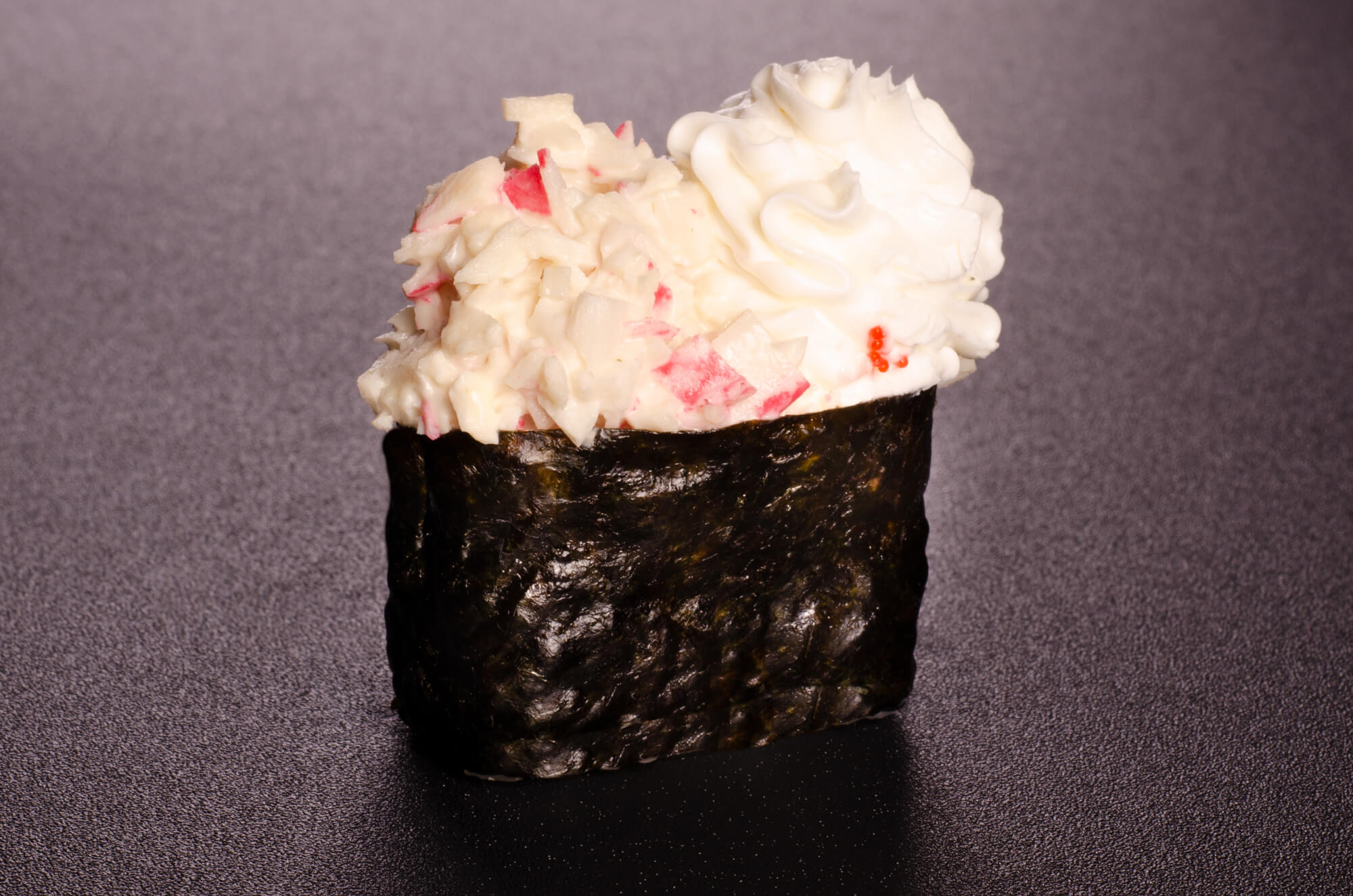 Суші гункан зі сніговим крабом, майонезом і сиром Філадельфія.