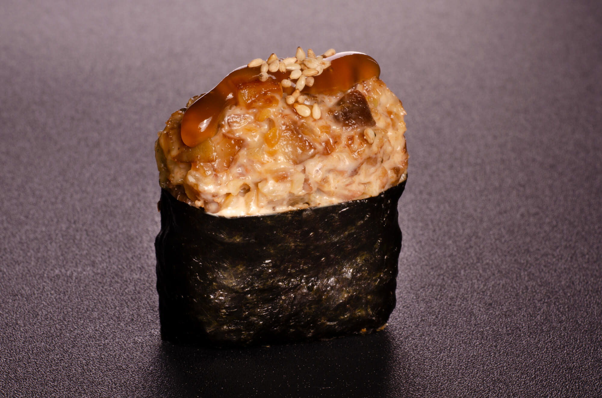 Суші гункан з копченим окунем і гострим соусом спайсі, прикрашений соусом унагі та білим кунжутом