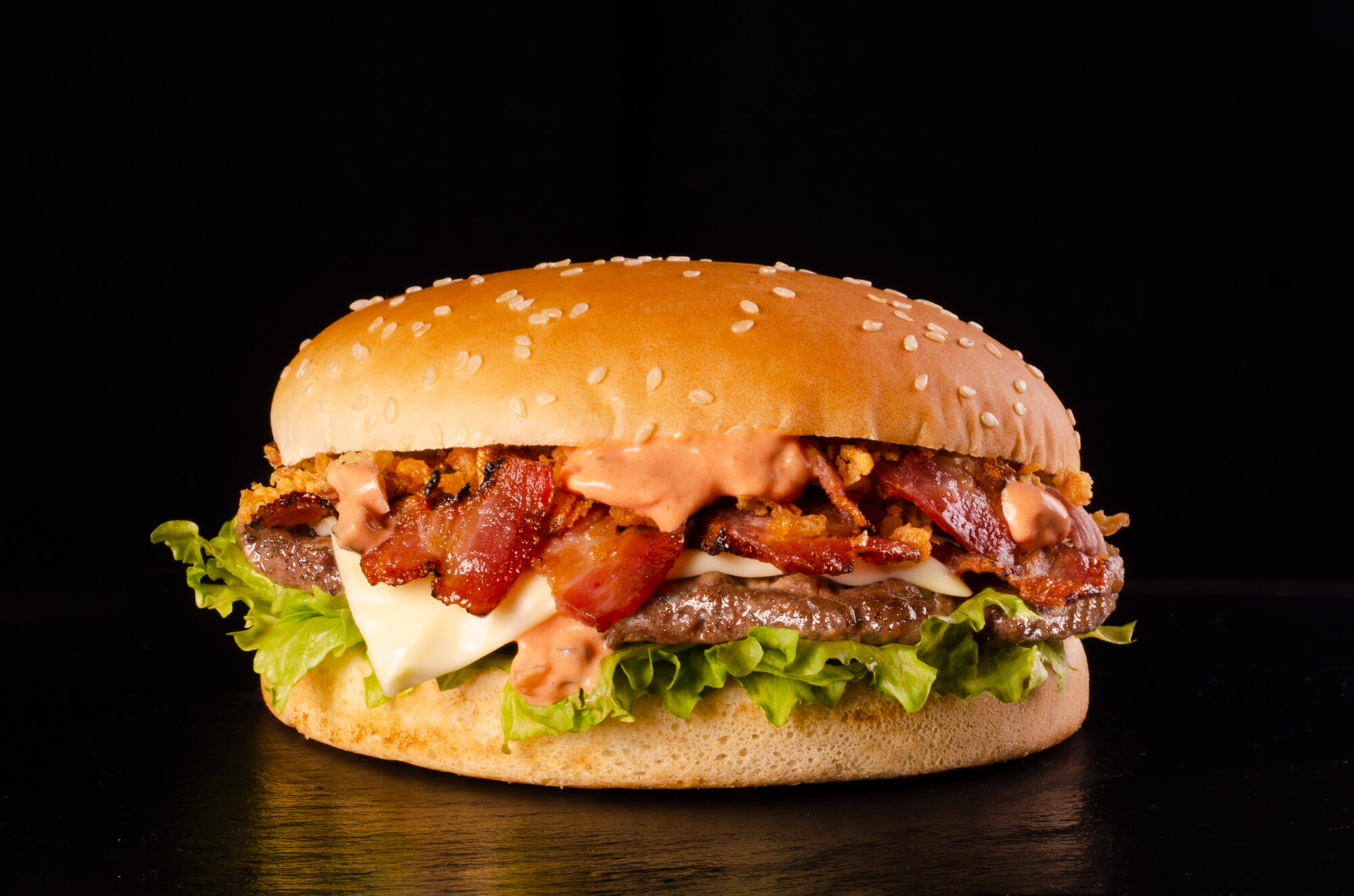 Котлета з яловичини, бекон смажений, сир тостовий, салат Айсберг, цибуля криспі, соус.