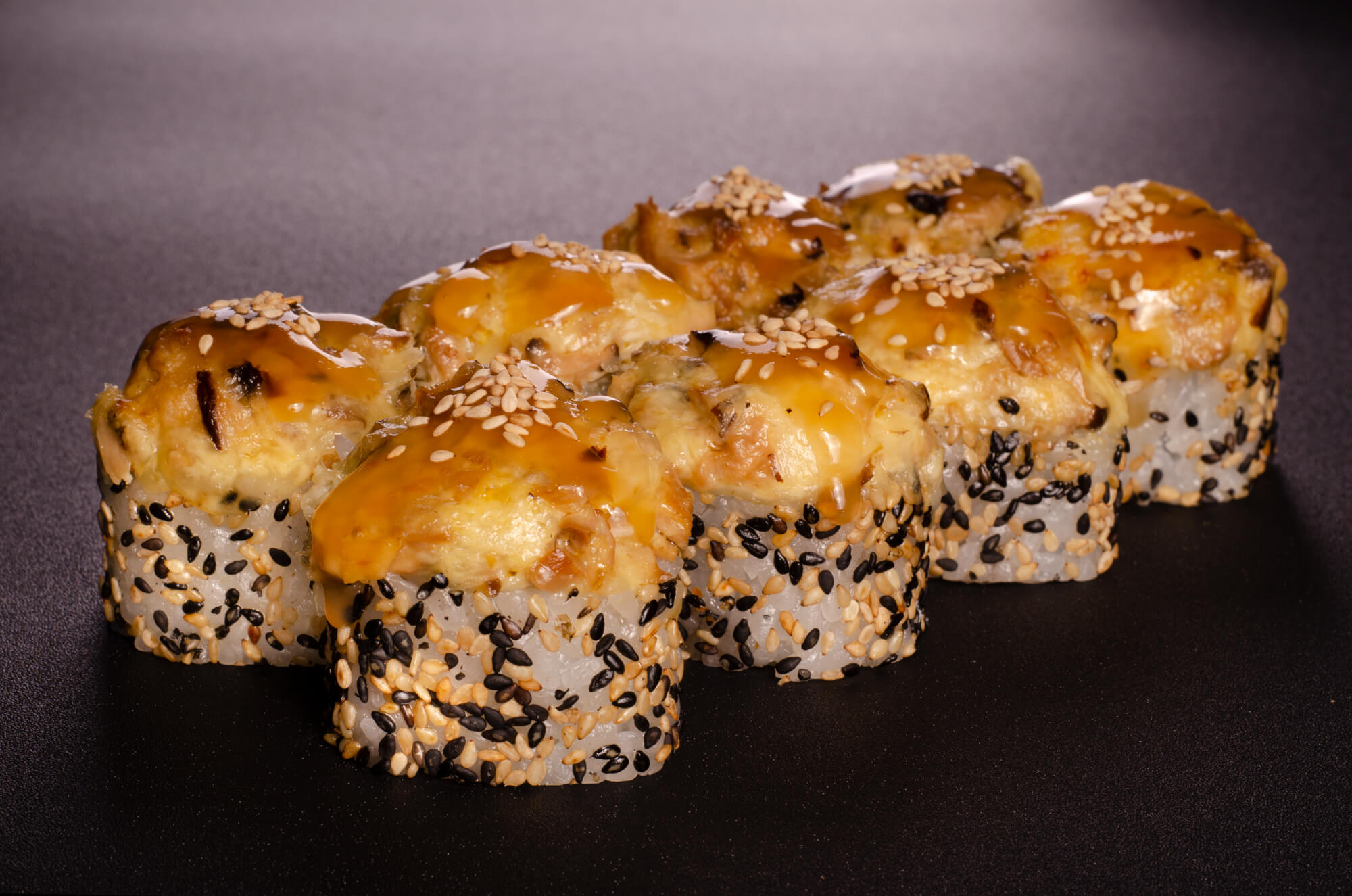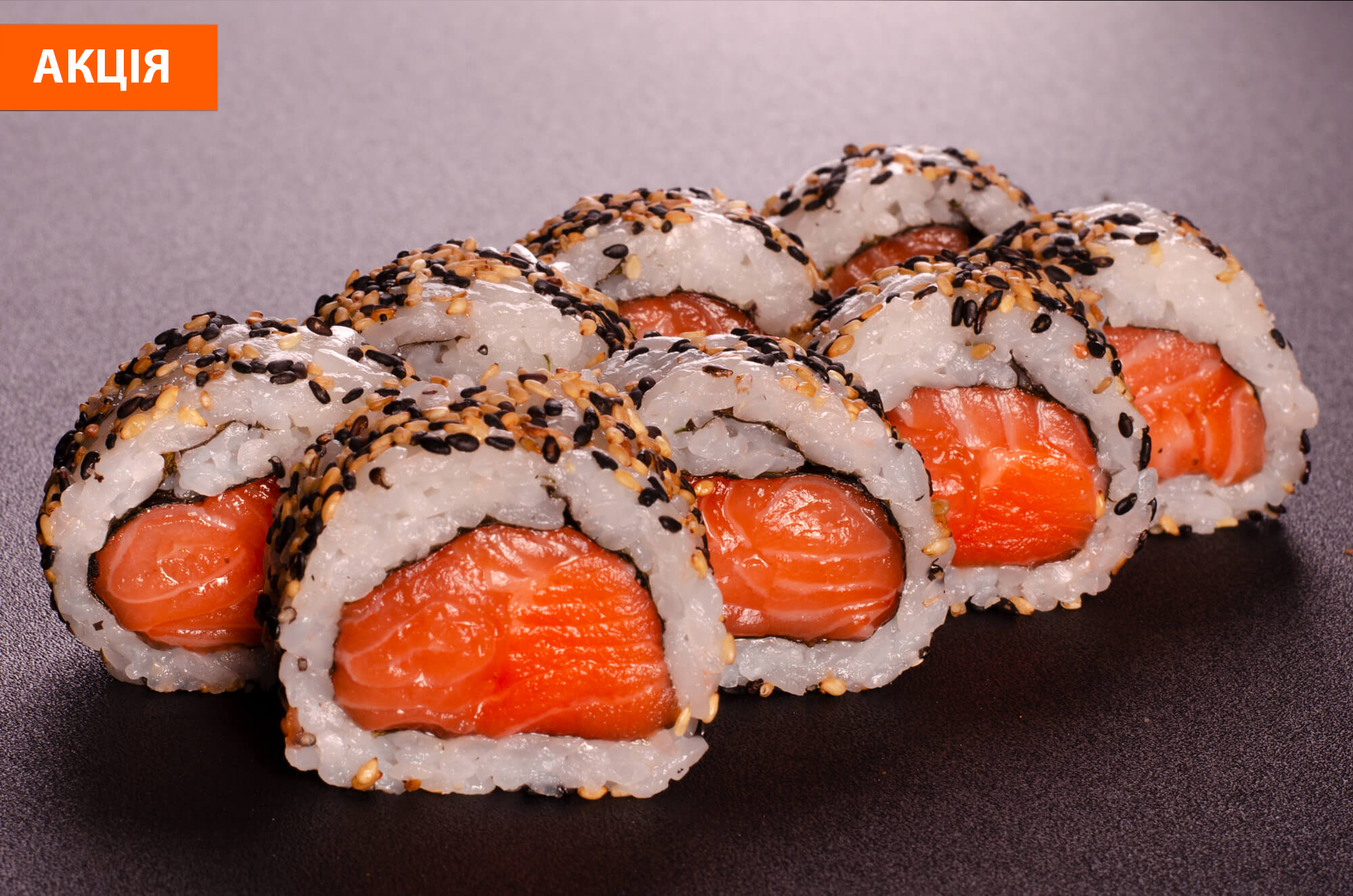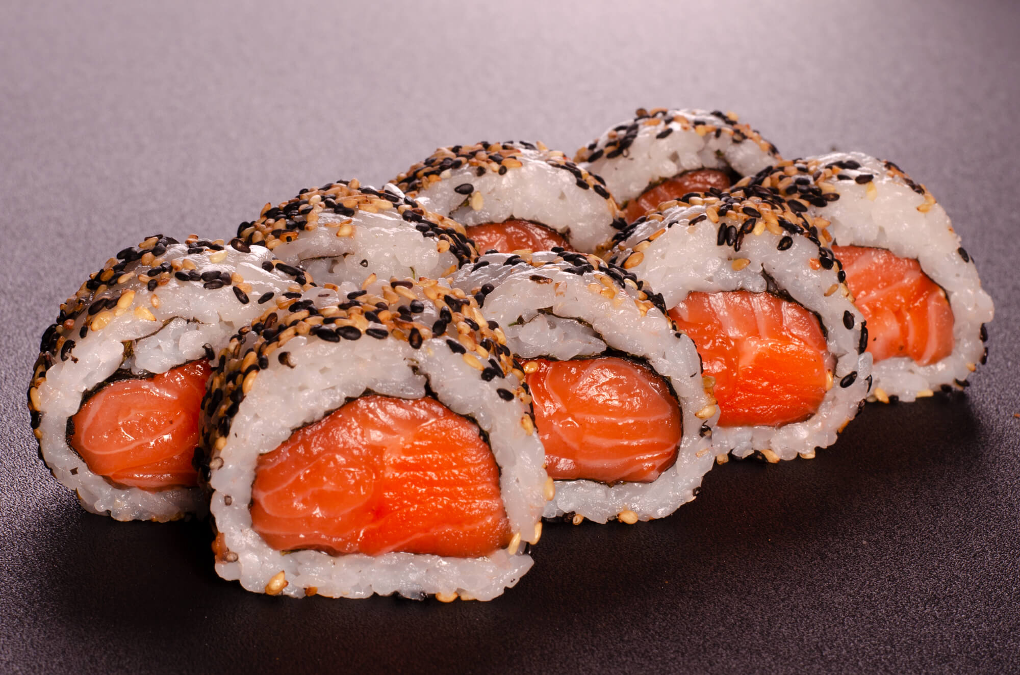 Рол з лососем, сиром філадельфія, авокадо в чорно-білому кунжуті.