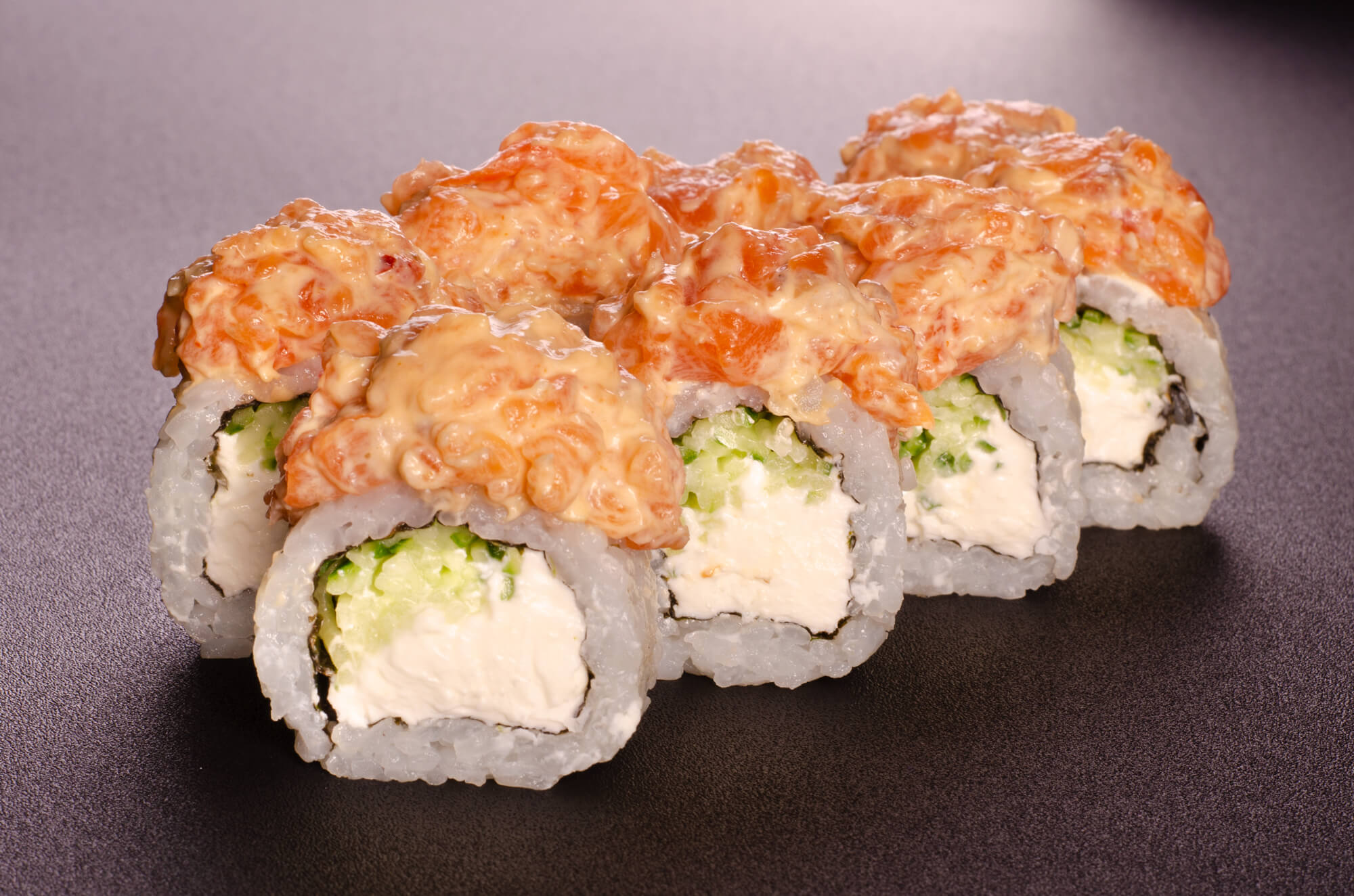 Рол з лососем, крабовим м'ясом, сиром філадельфія, огірком, ікрою масаго. Прикрашений сиром філадельфія та ікрою масаго