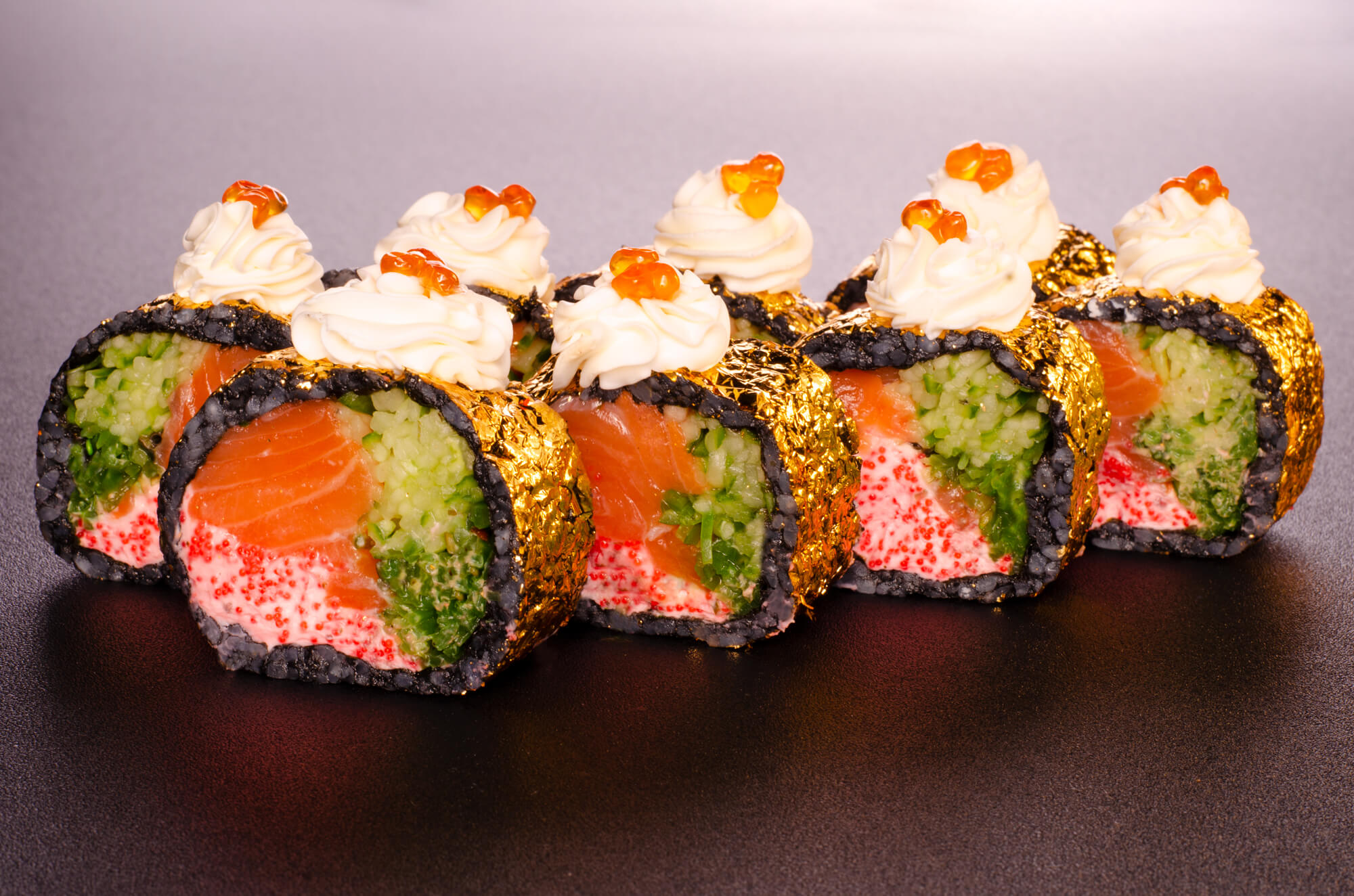 Рол з чорним рисом, лососем, рожевим сиром філадельфія, огірком, салатом чука, золотом. Прикрашений сиром Філадельфія та червоною ікрою.