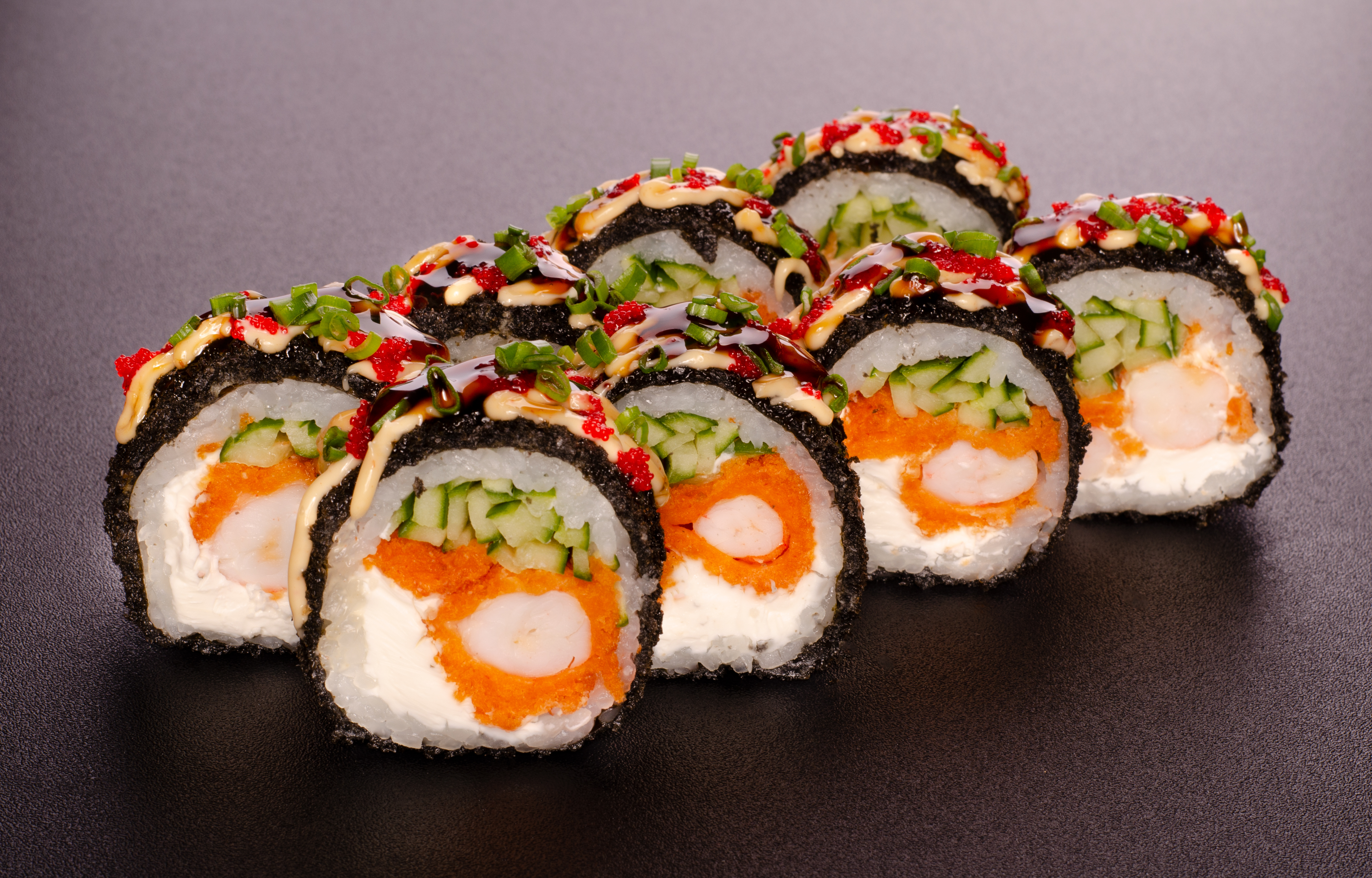 Рол з тигрової креветкою, огірком та сиром Філадельфія. Прикрашений ікрою масаго