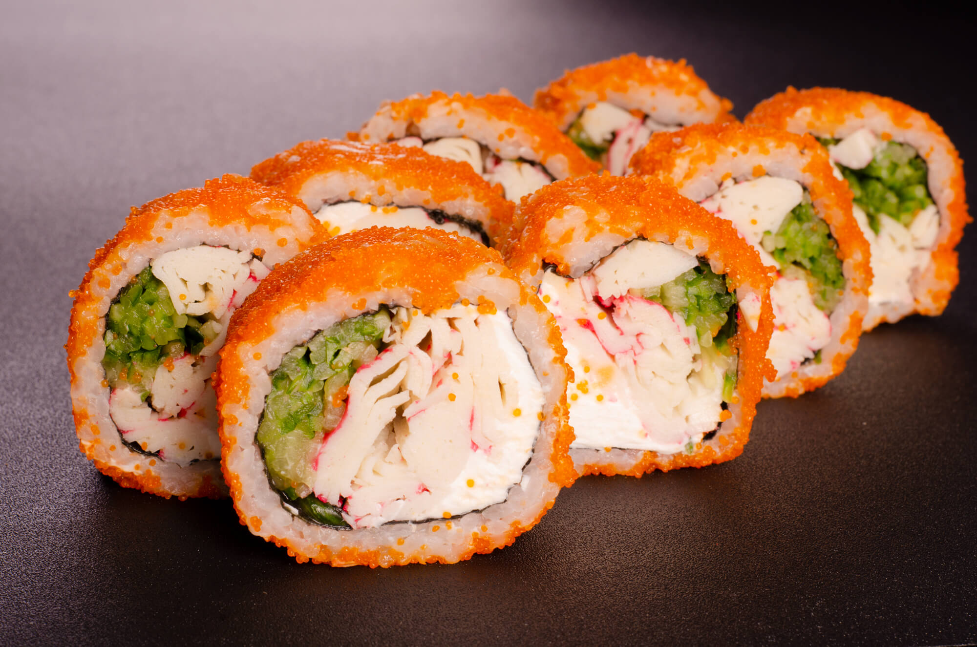 Рол з крабовим м'ясом, сиром філадельфія, огірком, прикрашений ікрою масаго.