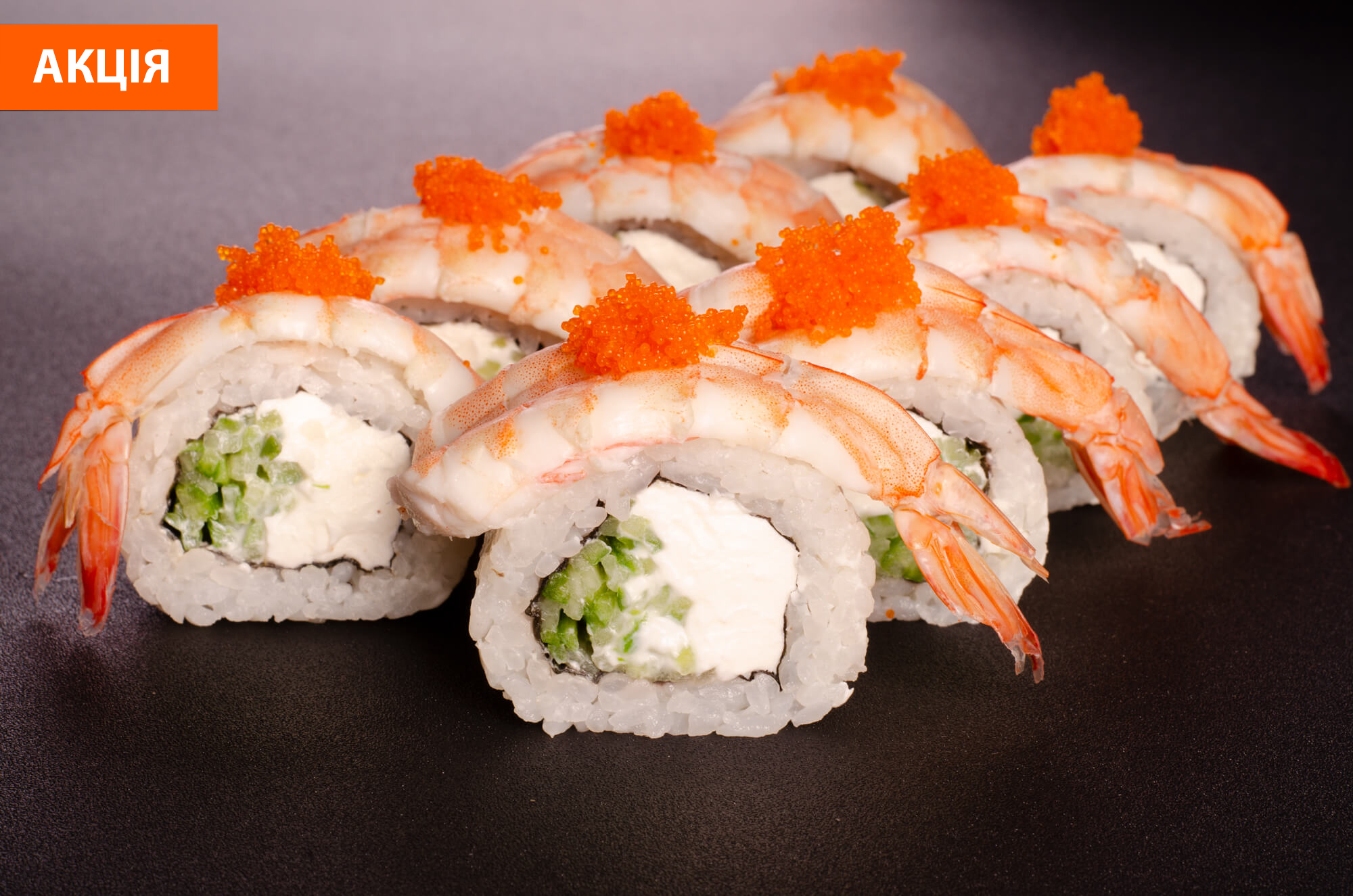 Рол з тигровою креветкою, сиром філадельфія, грибами шиїтаке та огірком. Прикрашений ікрою масаго.