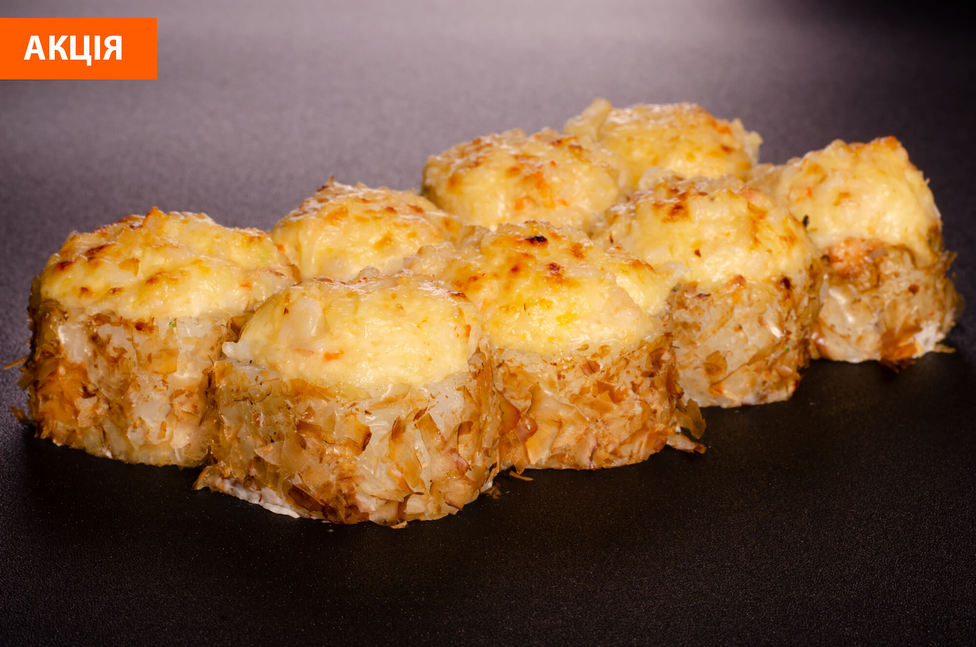 Рол зі смаженими грибами, грибами шиїтаке, сиром філадельфія, салатом айсберг, сирним соусом, соусом унагі, сиром пармезан у чорно-білому кунжуті.