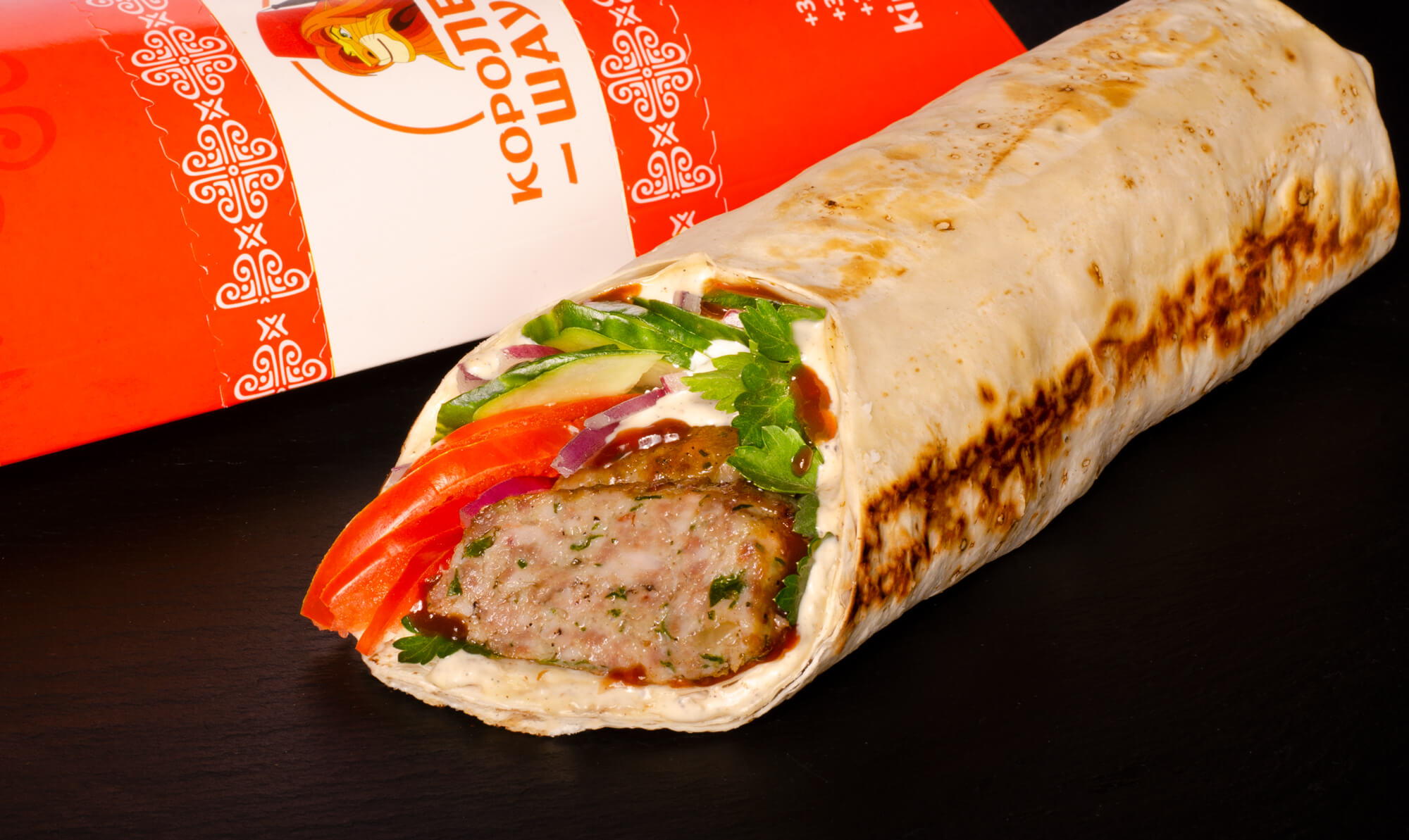 Лаваш, 2 фірмові соуси, люля-кебаб, помідори, огірки, цибуля кримська.