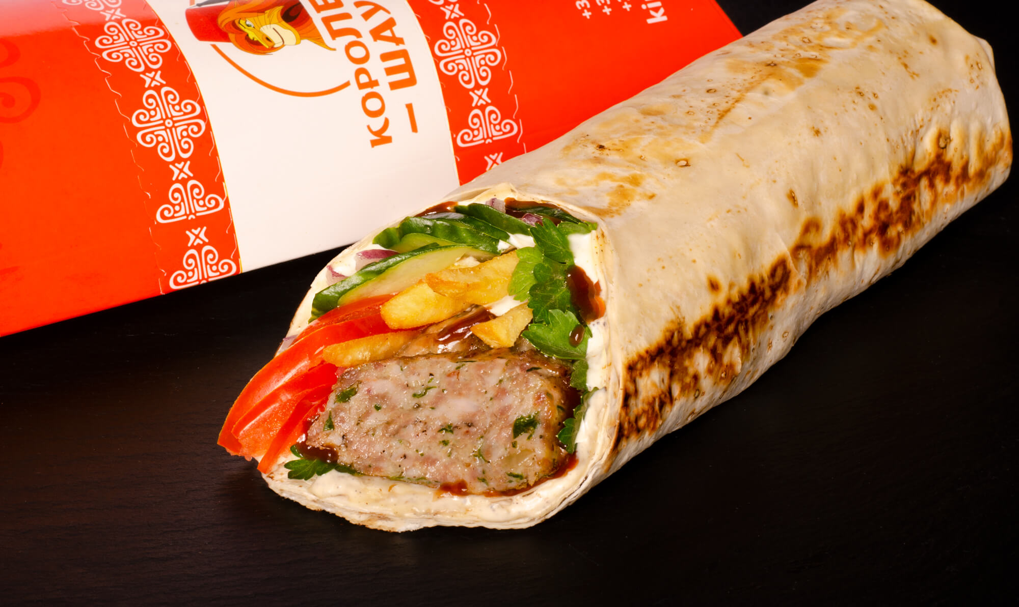 Лаваш, 2 фірмові соуси, люля-кебаб, картопля фрі, помідори, огірки, цибуля кримська.
